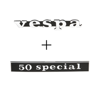 TARGHETTA SCRITTA STEMMA ANTERIORE POSTERIORE VESPA 50 SPECIAL FREGIO ALLUMINIO