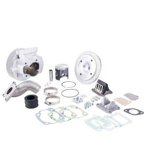 Vespa 50-125/PV/ET3/PK/S/XL/2 alluminio 5 travasi Ø 57,0mm corsa 51mm biella: 97.0mm incl. testa cilindro immissione diretta incl. collettore Ø 25mm, valvola lamellare a 4 petali, candela obliqua