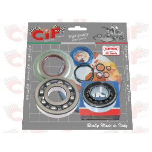 KIT REVISIONE ALBERO MOTORE C/PARAOLI CORTECO VESPA 125 T5 CRANKSHAFT REVISION KIT WITH CORTECO OIL SEALS PIAGGIO VESPA 125 T5 COMPOSTO DA / COMPOSED OF: N.1 ART. 5912-LV PARAOLIO LATO FRIZIONE (LAMIERA ESTERNA-VITON MARRONE) / OIL SEAL IN VITON CLUTCH SIDE N.1 ART. 5907-C PARAOLIIO LATO VOLANO (CORTECO BLU) / OIL SEAL FLYWHEEL SIDE N.1 ART. 5829-8S CUSCINETTO LATO FRIZIONE / ROLLER BEARING CLUTCH SIDE N.1 ART. 5823 CUSCINETTO SKF 25-52-15 (NU 205 EPC-C3) LATO VOLANO/ BEARING FLYWHEEL SIDE N.1 ART. 7011-KT KT anellini OR KIT ANELLI OR / OR RINGS SET